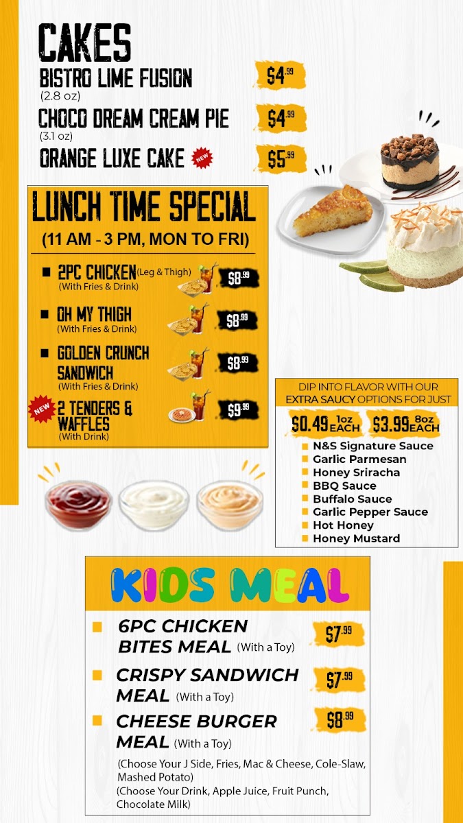 Choose your side-fries, mac and cheese, cole slaw, and mashed potatoes. Choose your drink-apple juice, Fruit Punch, or chocolate milk.